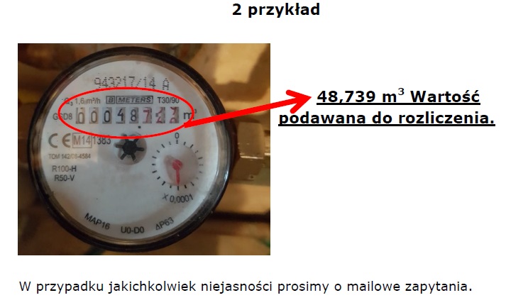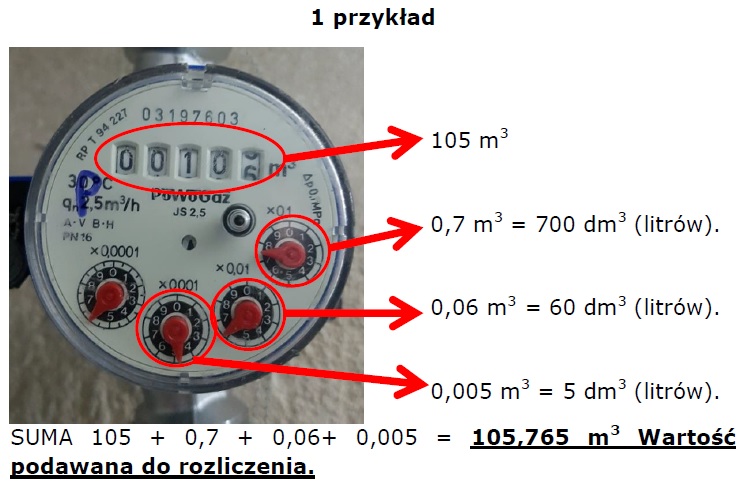 W celu poprawnego rozliczenia zużycia wody i ścieków należy przede wszystkim podać prawidłowy odczyt wodomierza. Poniżej przedstawiamy skrócona instrukcje prawidłowego odczytu wodomierza. Bardzo ważnym jest aby widzieć gdzie należy postawić „przecinek”.